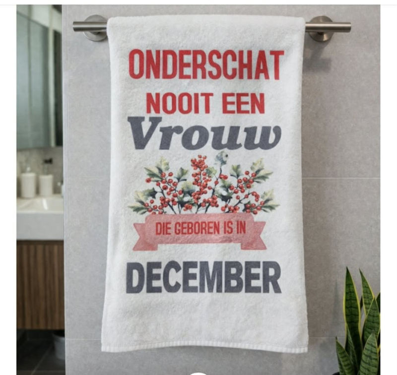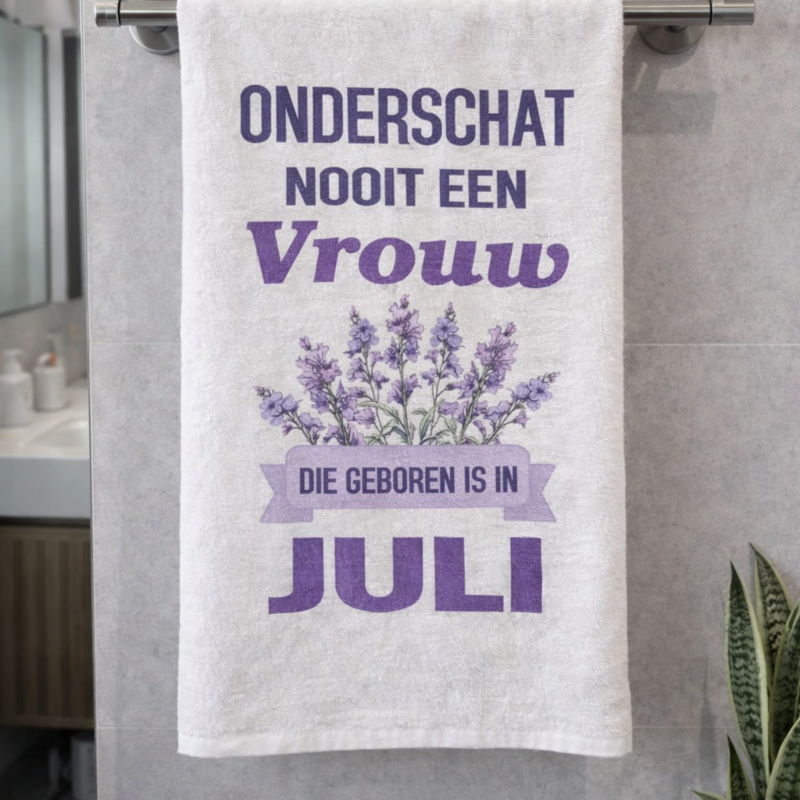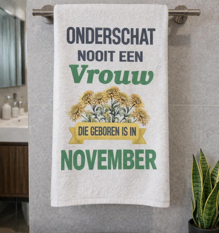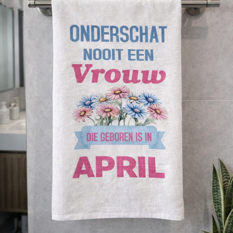 Deze stijlvolle handdoek is bedrukt met de tekst: “Onderschat nooit een vrouw die geboren is in [maand]” en wordt prachtig aangevuld met bijpassende geboortebloemen. Een uniek en persoonlijk cadeau voor elke vrouw!