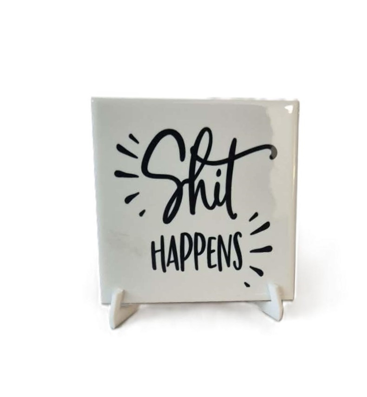 Grappige toilet tegel incl houder Shit happensBedrukte keramische toiletttegel met grappige spreuk (11x11 cm)