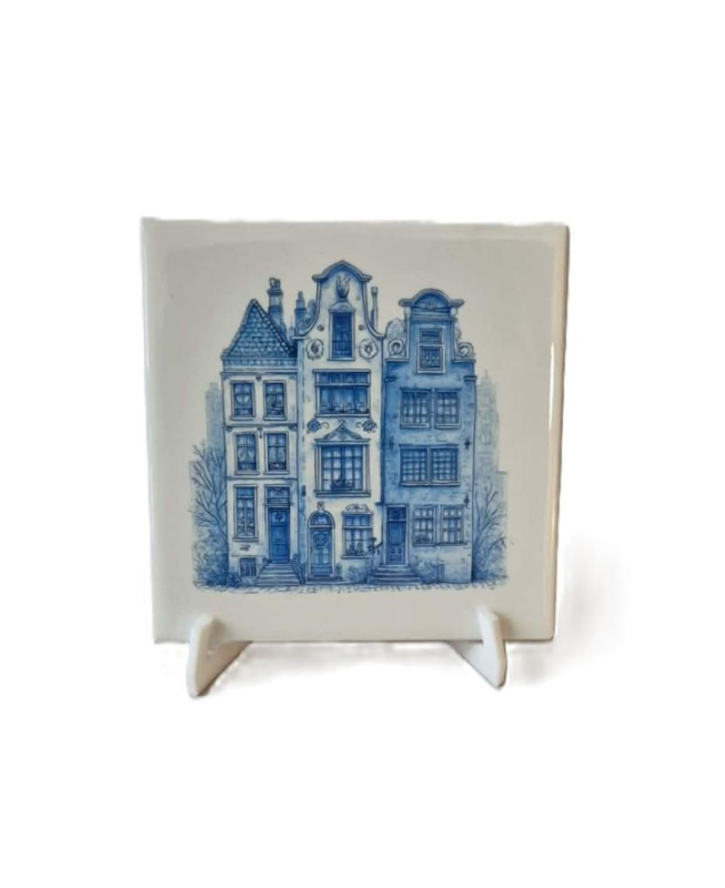 Bedrukte tegel amsterdamse huisjesDeze decoratieve tegeltje met blauwe tinten zijn geïnspireerd op echte Hollandse tradities. , afmetingen zijn 11x11 cm , wordt geleverd incl een 3 d geprinte houder , maar u kunt deze natuurlijk ook ophangen