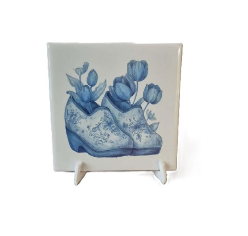 Bedrukte tegel blauwe klompen met tulpenDeze decoratieve tegeltje met blauwe tinten zijn geïnspireerd op echte Hollandse tradities. , afmetingen zijn 11x11 cm , wordt geleverd incl een 3 d geprinte houder , maar u kunt deze natuurlijk ook ophangen