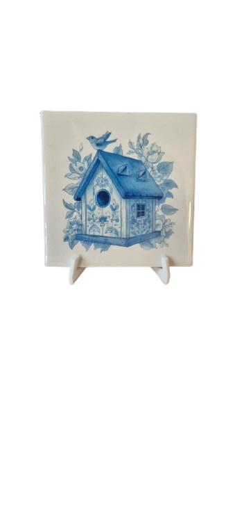 Bedrukte tegel vogel huisjeDeze decoratieve tegeltje met blauwe tinten zijn geïnspireerd op echte Hollandse tradities. , afmetingen zijn 11x11 cm , wordt geleverd incl een 3 d geprinte houder , maar u kunt deze natuurlijk ook ophangen