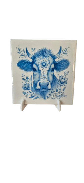 Bdrukte tegen blaue tinten koeDeze decoratieve tegeltje met blauwe tinten zijn geïnspireerd op echte Hollandse tradities. , afmetingen zijn 11x11 cm , wordt geleverd incl een 3 d geprinte houder , maar u kunt deze natuurlijk ook ophangen