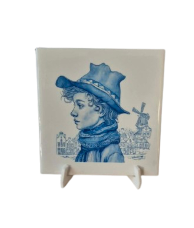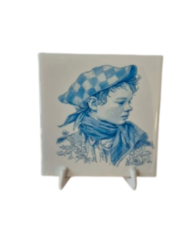 Bedrukte tegel incl stander Jongen blauwe tintenDeze decoratieve tegeltje met blauwe tinten zijn geïnspireerd op echte Hollandse tradities. , afmetingen zijn 11x11 cm , wordt geleverd incl een 3 d geprinte houder , maar u kunt deze natuurlijk ook ophangen